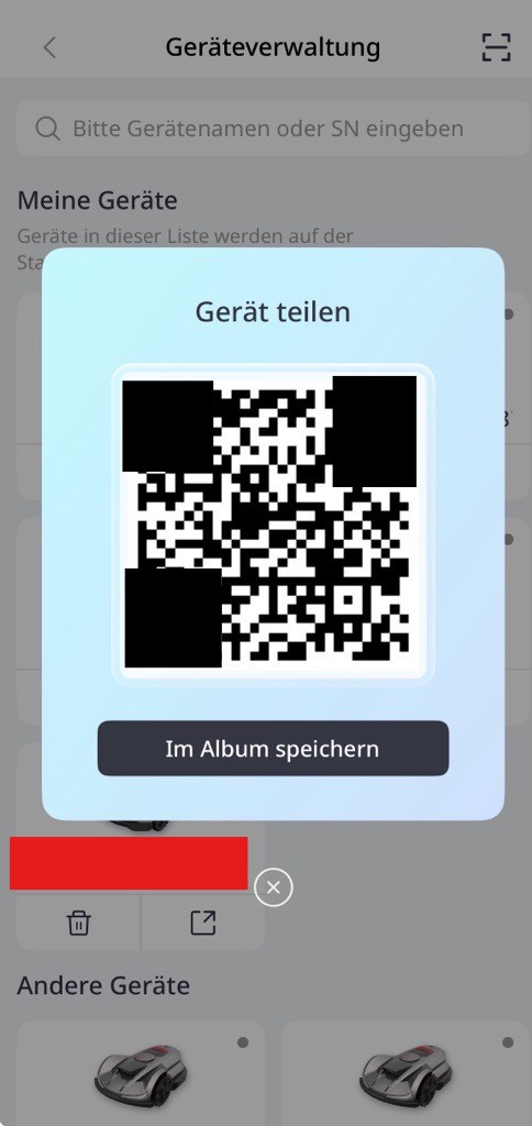 Die andere Person kann den Mähroboter anschließend ganz einfach hinzufügen, indem sie den angezeigten QR-Code mit ihrer Sunseeker App scannt.