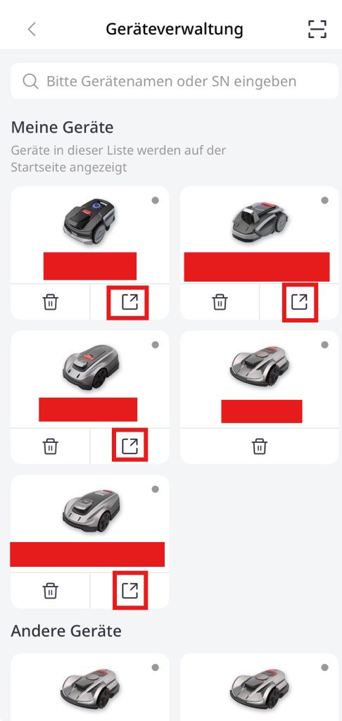 Wenn Sie den Mähroboter mit anderen Personen teilen möchten, tippen Sie in der App in der Hauptansicht (nicht in der Detailansicht) auf die Schaltfläche rechts neben dem Namen des Mähroboters und wählen „Teilen“ aus.