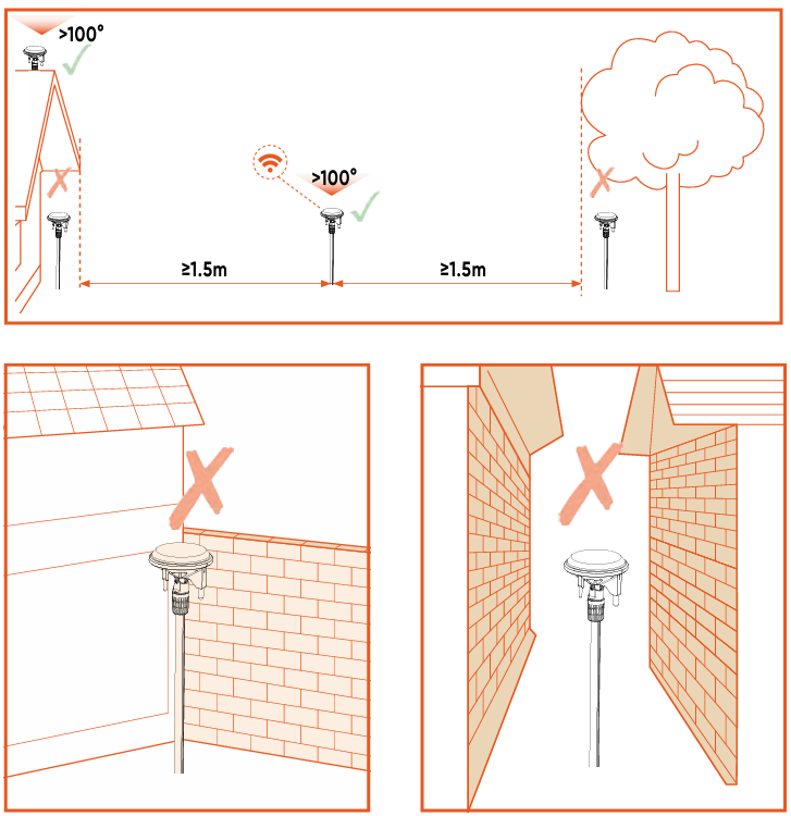 d. Der Abstand zwischen der Antenne und der Wand oder den Bäumen muss größer als 1,5 m sein.