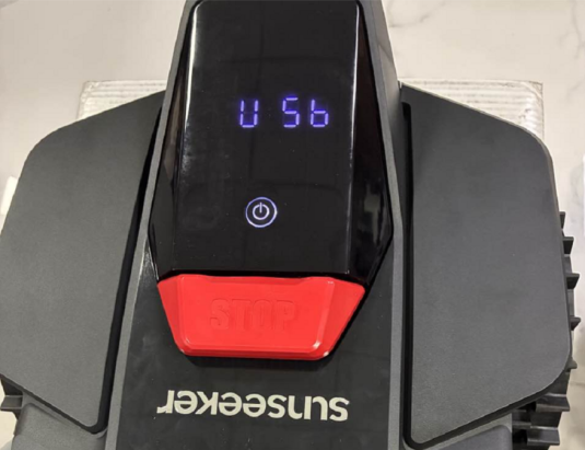 c. Nadat u het hebt geactiveerd, wacht u tot "opslaan" wordt weergegeven op het LCD-paneel van de grasmaaier. Dit geeft aan dat de USB-stick is herkend.
