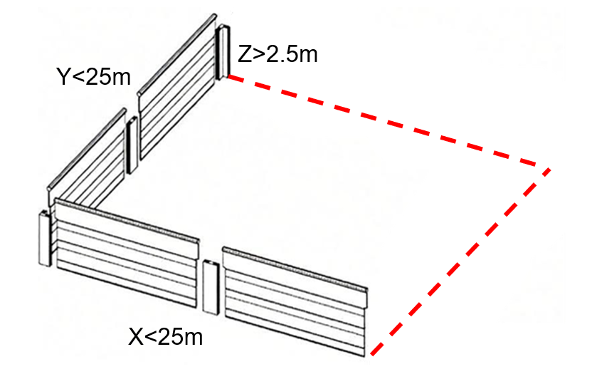 b. Als de tuin slechts twee referentiezijden heeft, ondersteunt de maaier alleen tuinen met één richting van minder dan 25 m, en de hoogte van de referentieobjecten moet hoger zijn dan 2,5 m.